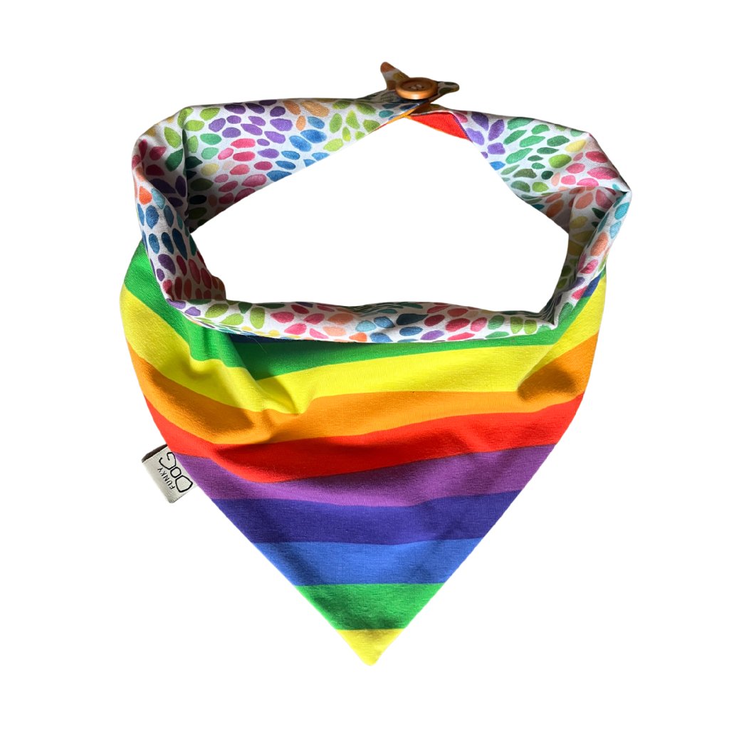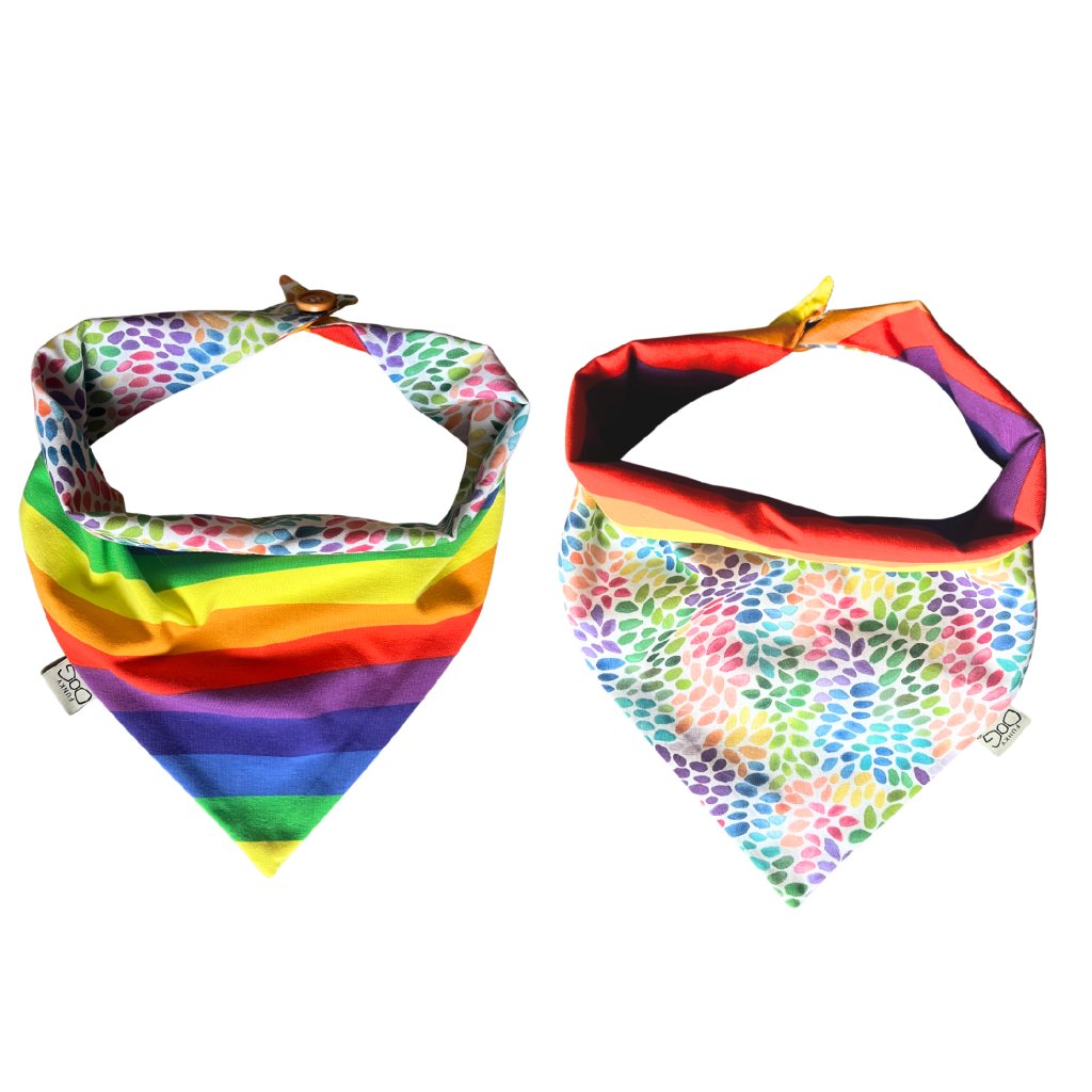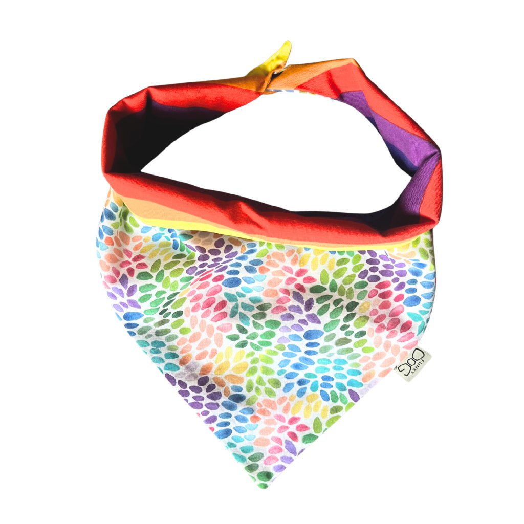 Stylový oboustranný šátek pro psy s duhovým motivem. Pohodlné zapínání, ruční výroba, snadná údržba. Pomozte pejskům v nouzi s každým nákupem! 🐾