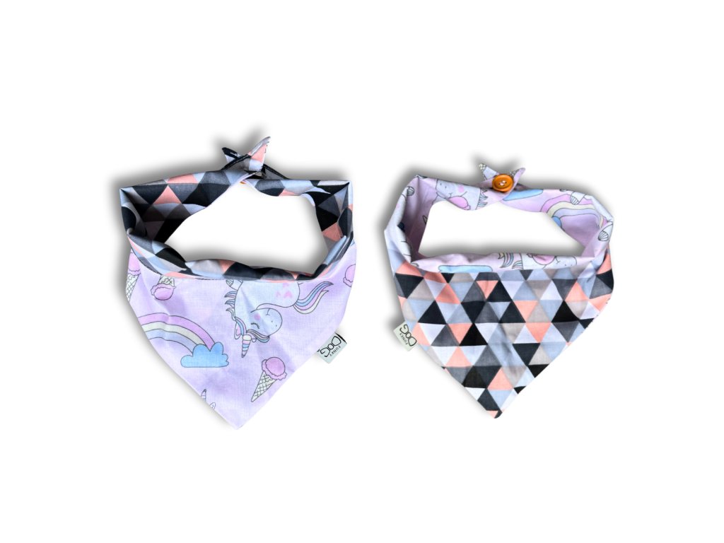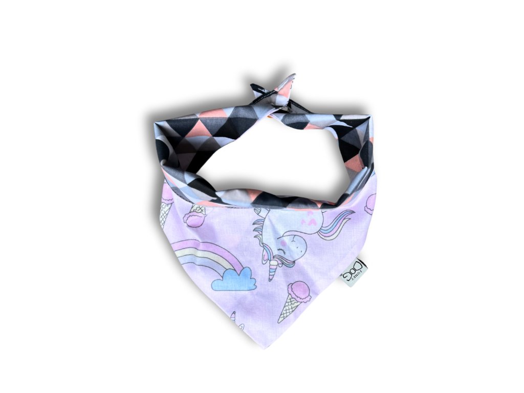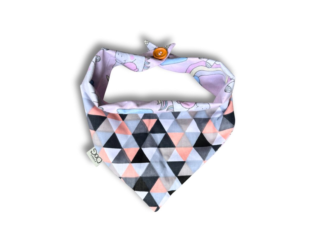 Hledáte originální a roztomilý psí šátek, který potěší nejen vás, ale i zvířata v útulcích? Tento růžový šátek s jednorožci a geometrickými trojúhelníky je ideální volba pro každého čtyřnohého parťáka, který chce dělat parádu a zároveň pomáhat.