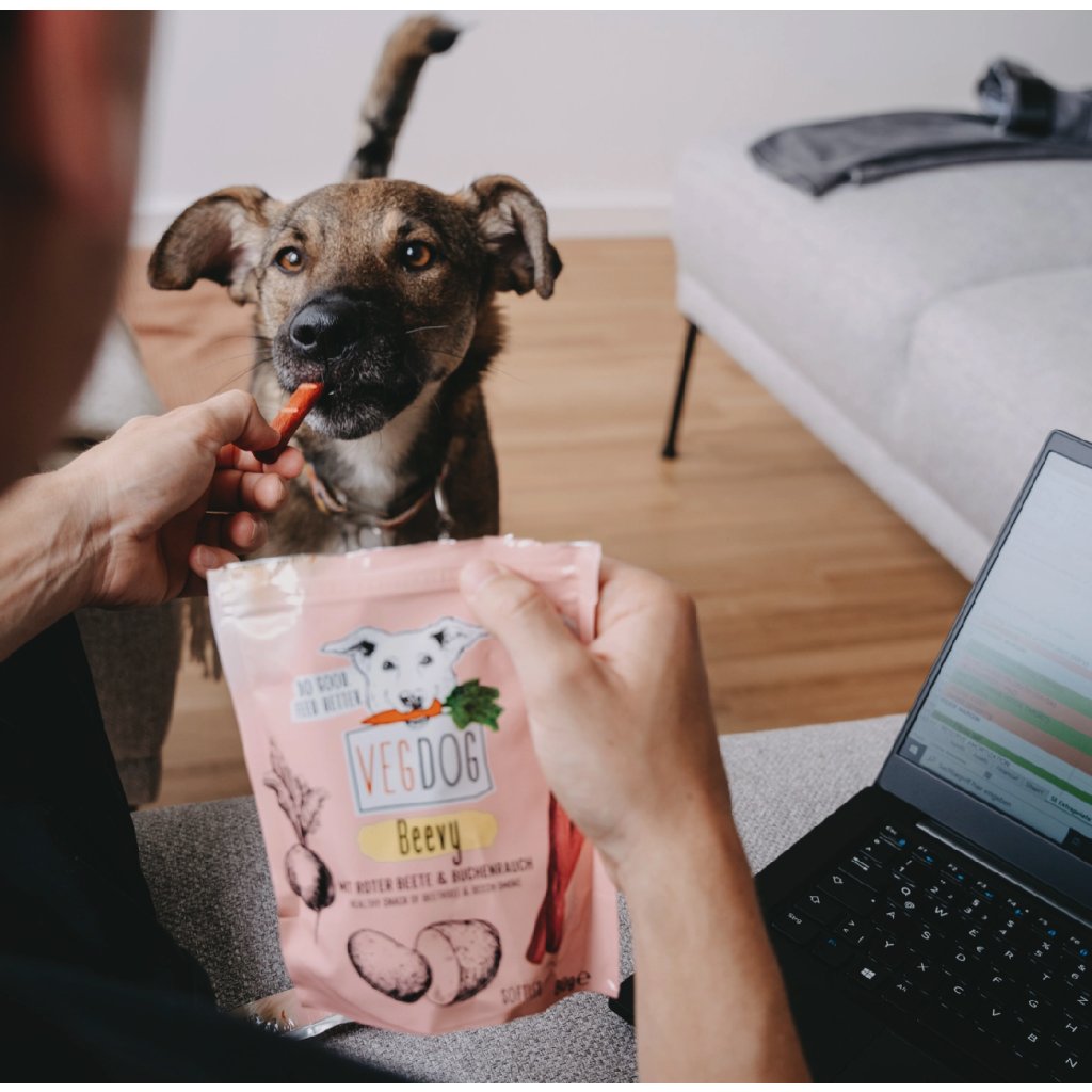 Udržitelná volba pro majitele psů – rostlinná receptura má nižší ekologickou stopu než běžné masové pamlsky.