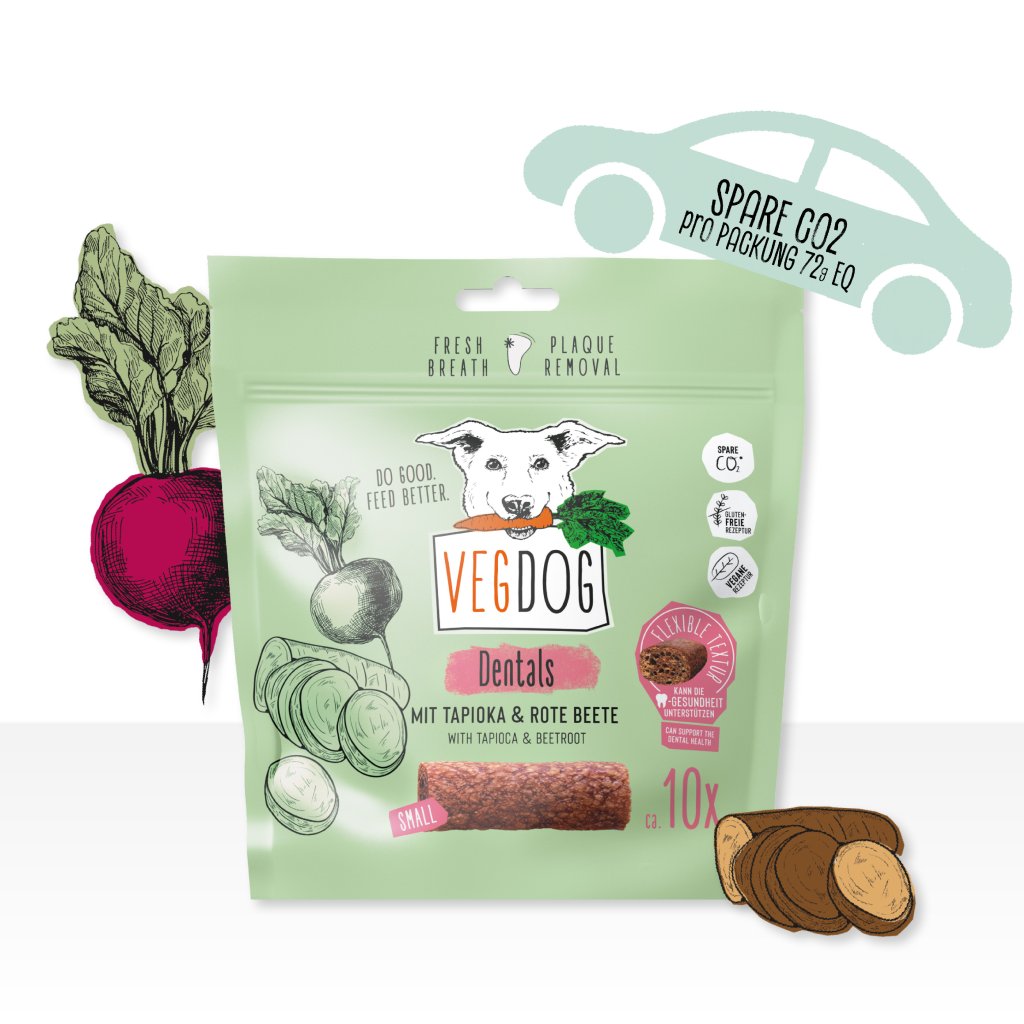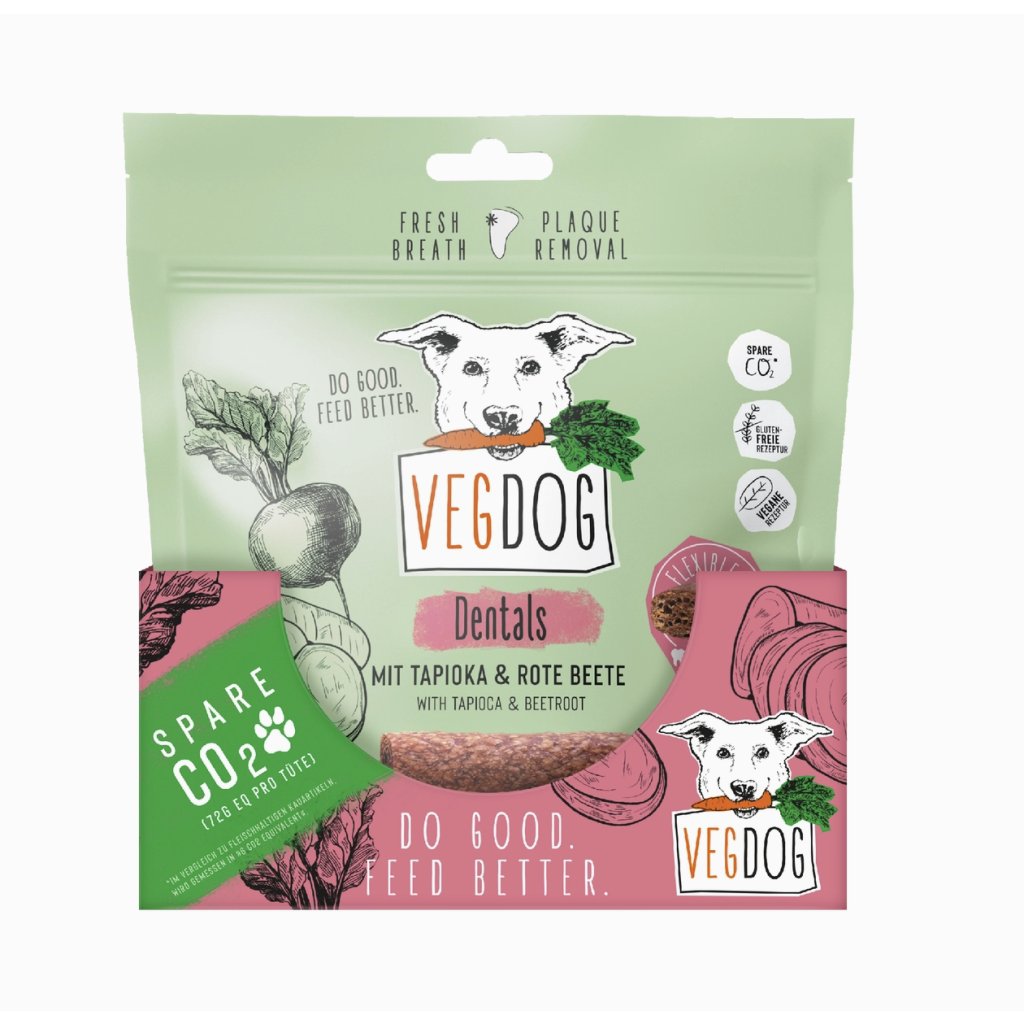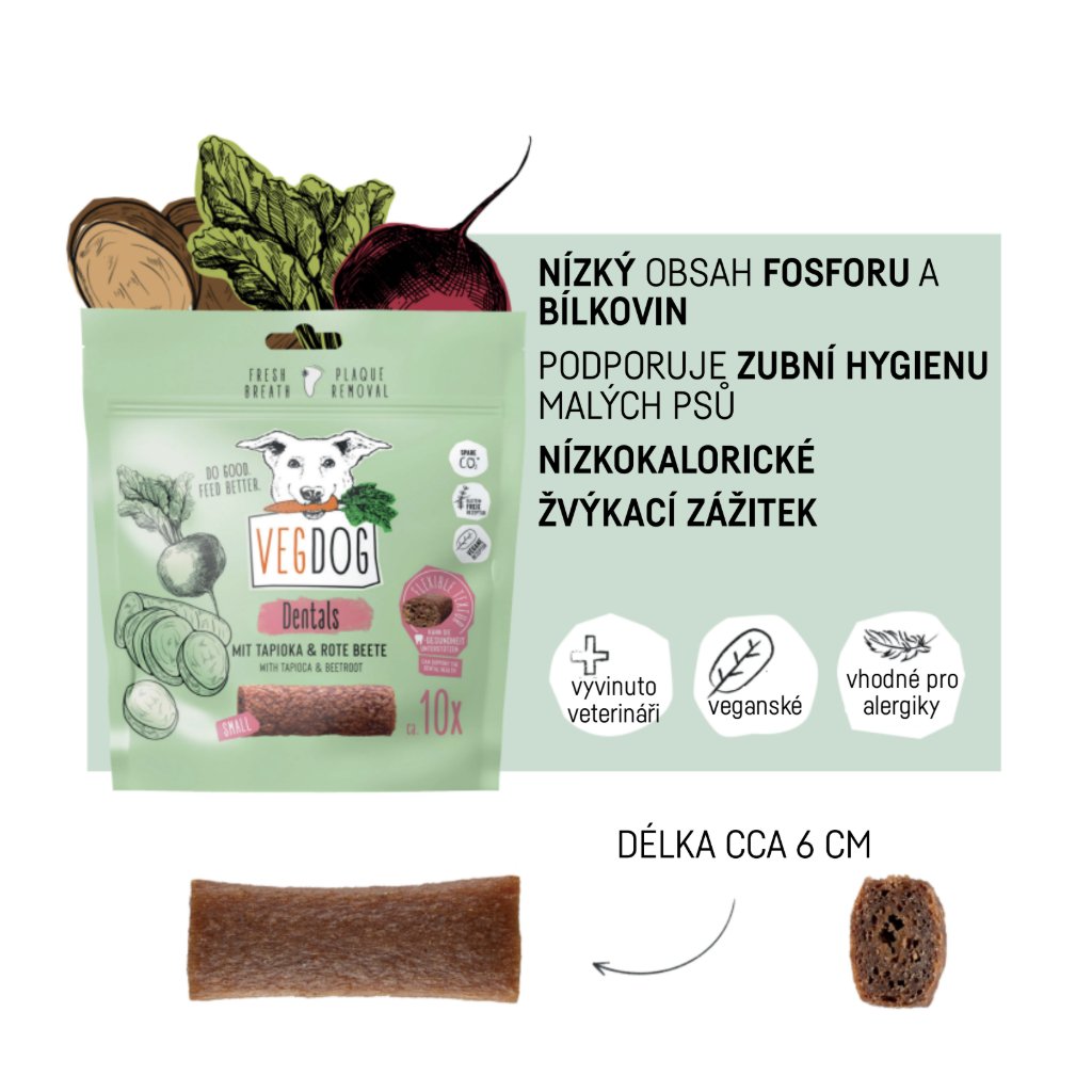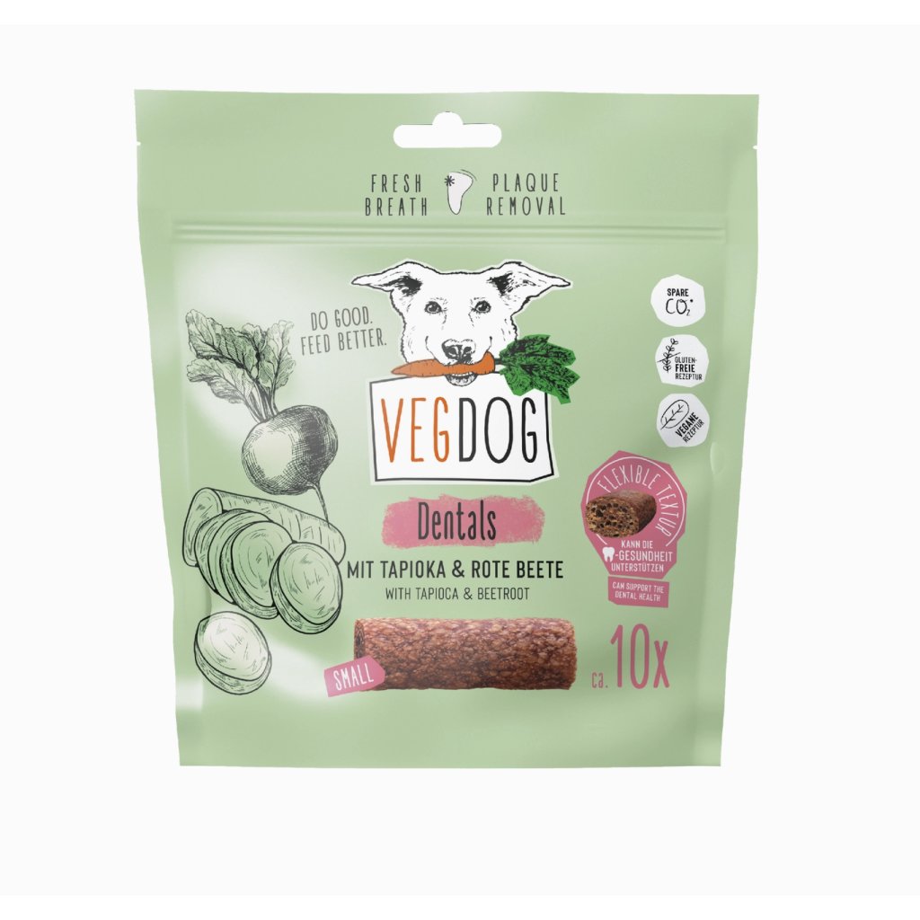 VEGDOG Dentals jsou 100% rostlinné dentální pamlsky speciálně vyvinuté pro psy, kteří potřebují šetrnou péči o zuby bez zbytečné chemie a živočišných alergenů. Díky přírodní receptuře pomáhají redukovat zubní plak, osvěžují dech a podporují zdravé dásně.