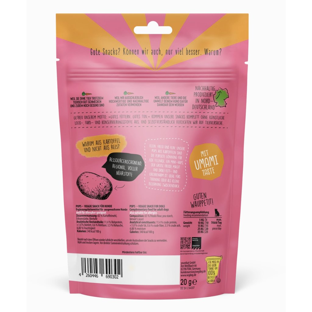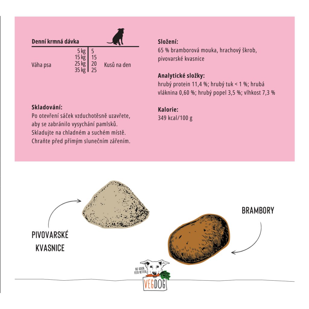 VEGDOG Pops jsou 100% rostlinné, křupavé odměny vyrobené z vysoce stravitelných surovin, které pomáhají řešit nejčastější problém pamlsků – přetěžování trávení a potravinové intolerance. Díky hypoalergenní receptuře jsou ideální i pro psy s citlivým žaludkem, alergiemi a redukční dietou.